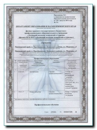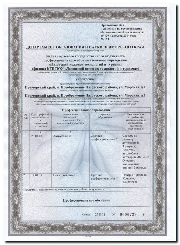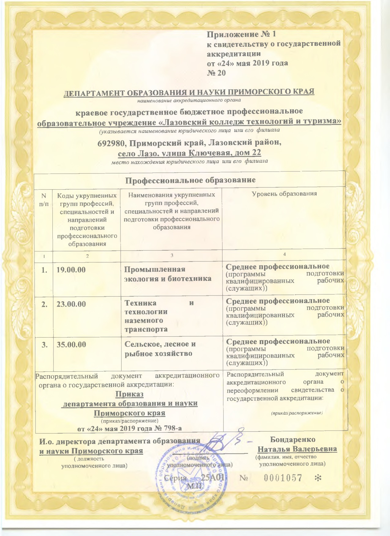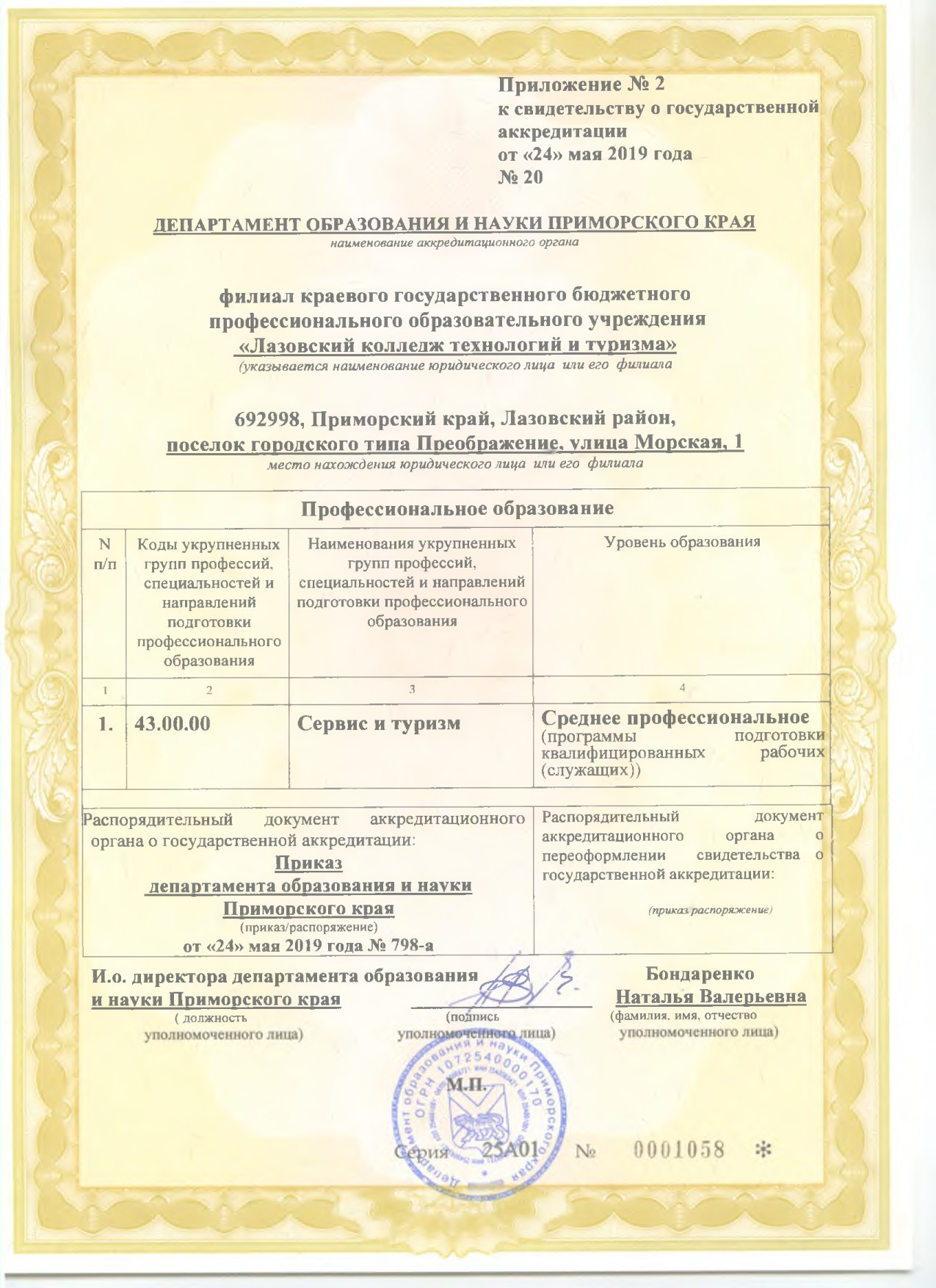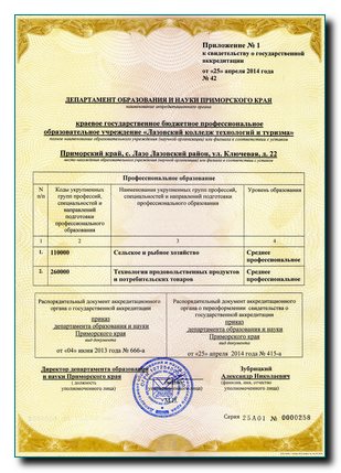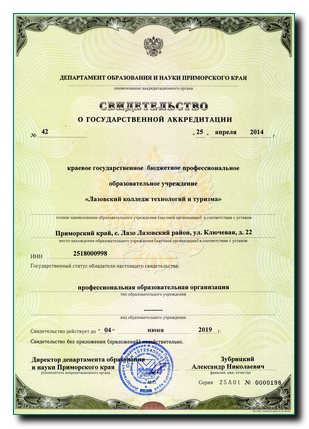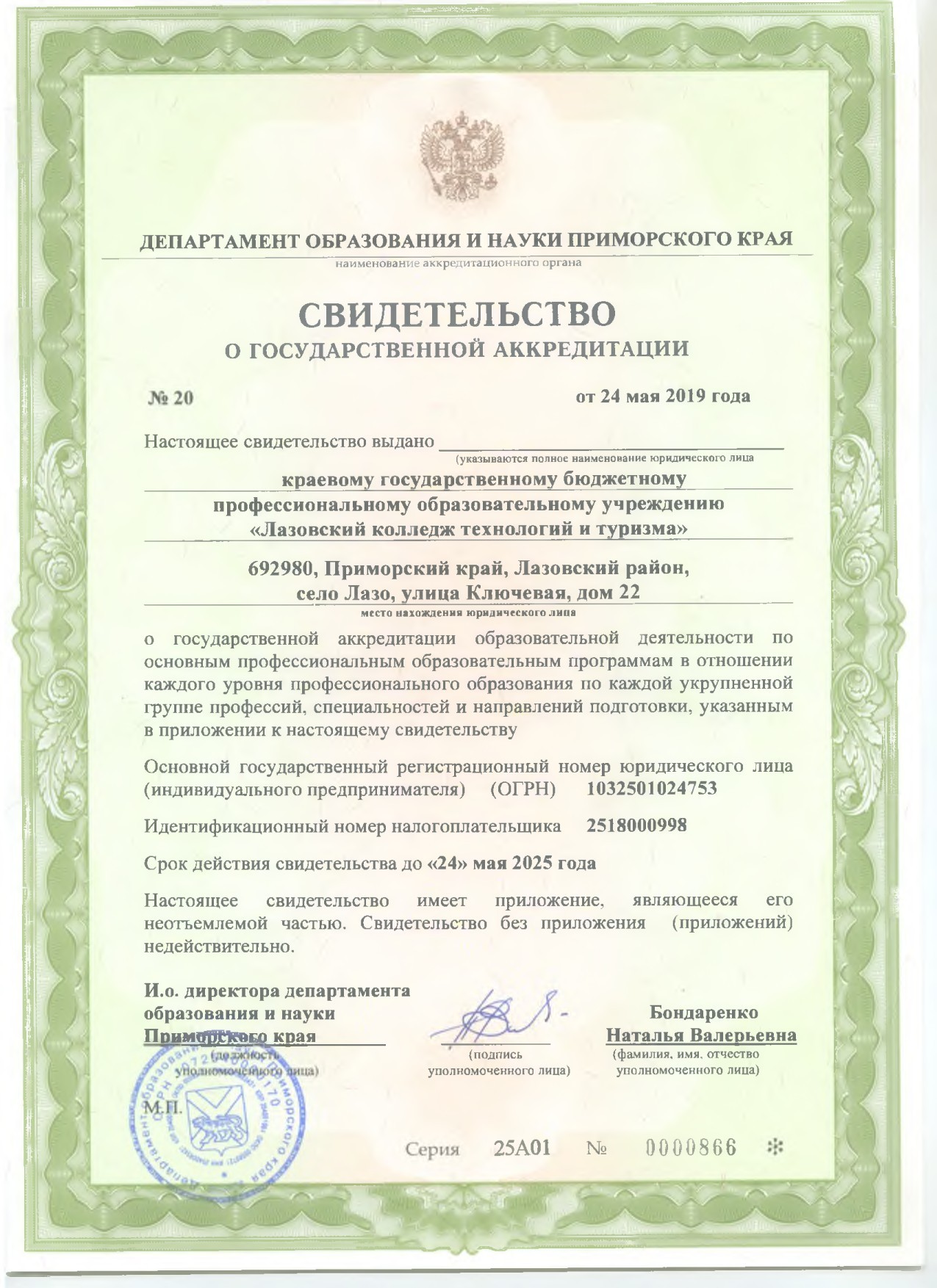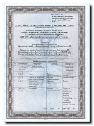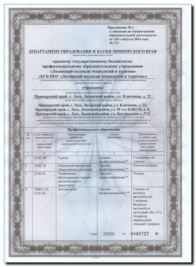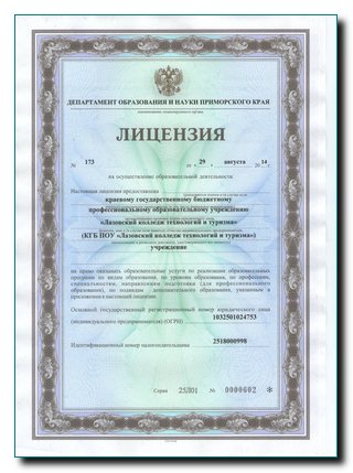 Регистрационные данные: КРАЕВОЕ ГОСУДАРСТВЕННОЕ БЮДЖЕТНОЕ ПРОФЕССИОНАЛЬНОЕ ОБРАЗОВАТЕЛЬНОЕ УЧРЕЖДЕНИЕ "ЛАЗОВСКИЙ КОЛЛЕДЖ ТЕХНОЛОГИЙ И ТУРИЗМА"