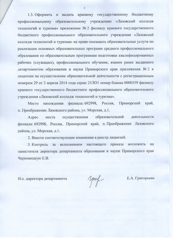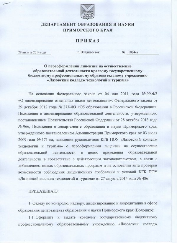 О государственной аккредитации КГБ ПОУ «Лазовский колледж технологий и туризма» и его филиала