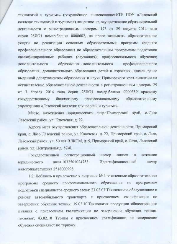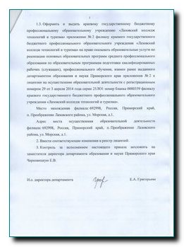 Полное наименование филиала: филиал краевого государственного бюджетного профессионального образовательного учреждения «Лазовский колледж технологий и туризма».