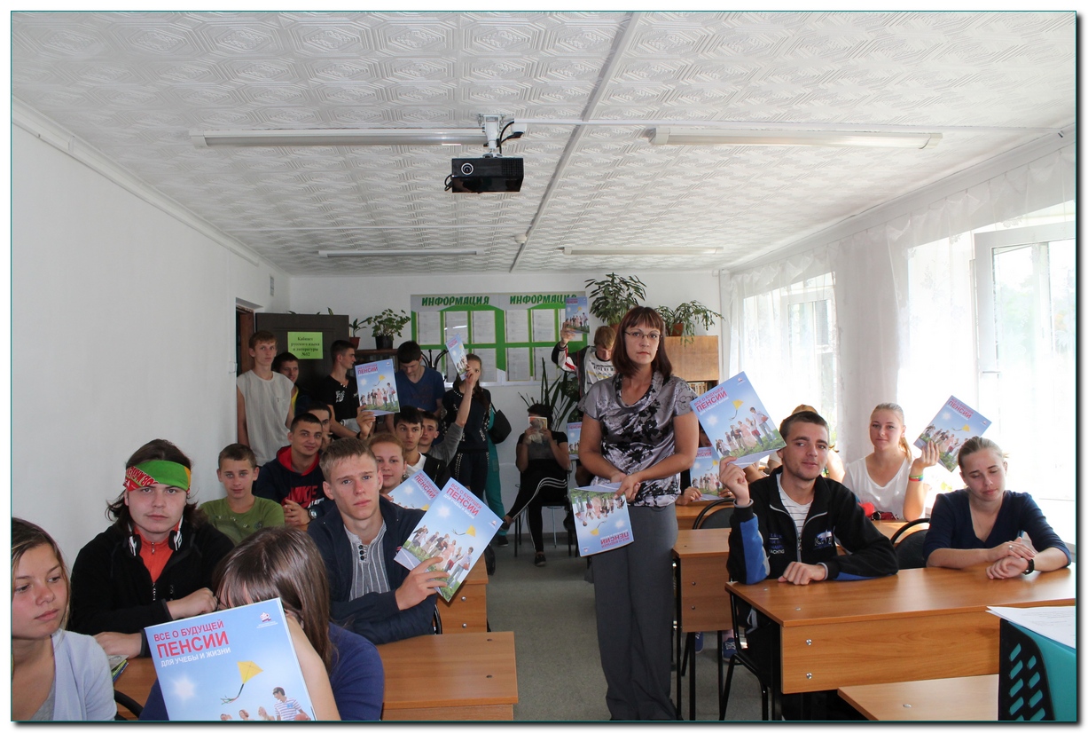 22 сентября 2015 года в Лазовском колледже технологий и туризма состоялась встреча со специалистами Пенсионного фонда, посвященная Дню пенсионной грамотности. Студентам всех курсов рассказали об истории пенсий России, о пенсионном фонде Российской Федерации, а так же для чего необходим СНИЛС (Страховой номер индивидуального лицевого счета). |