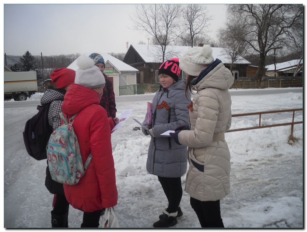 Ежегодно 9 декабря в России отмечается День Героев Отечества. В связи с этим студенты колледжа вышли на улицы с. Лазо с буклетами о героях ВОВ, чьи имена вошли в историю нашего района. |