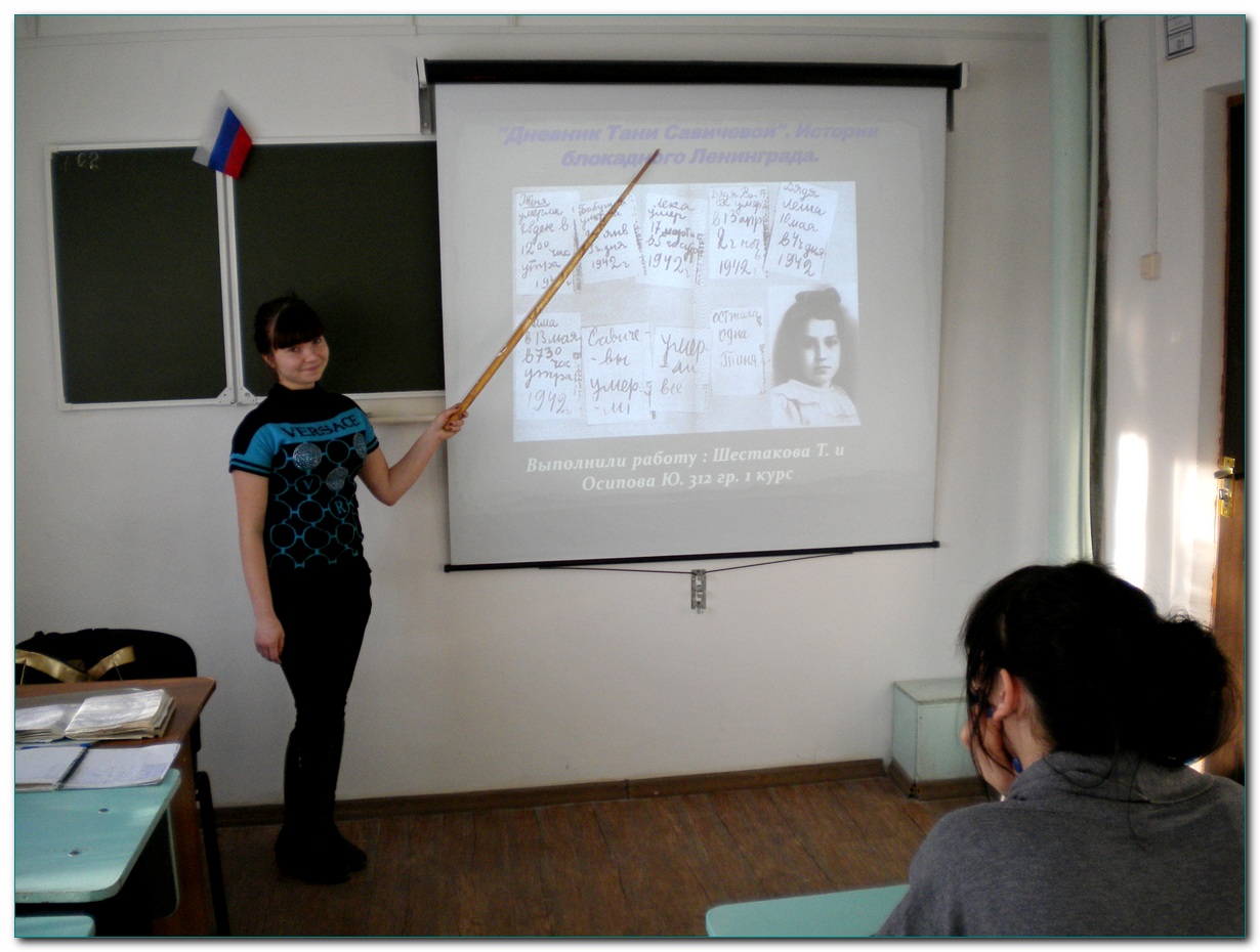 27 января в колледже прошли уроки мужества, посвященные 70-летию снятия блокады Ленинграда. Учащиеся 312 группы (Ю.Осипова и Т. Шестакова) и учащиеся 322 группы (А. Куличенко и В. Ли) подготовили презентации и выступили с ними перед своими одногруппниками |
