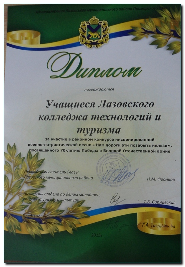 В 2015 году вся страна будет отмечать 70 лет со дня Победы в Великой Отечественной войне. Сколько бы ни прошло времени, не сменилось поколений, День Победы был и остается главным праздником страны, дорогим и близким для каждого из нас. Ведь именно он вселяет гордость за Россию, за наш народ, который «всем смертям на зло» выстоял и победил в этой великой битве. Большое количество мероприятий проводится накануне празднования юбилея Дня Победы, которые воспитывают патриотов своего отечества, способного выполнять гражданский долг, как в мирное, так и военное время. Вот и студенты Лазовского колледжа не остались в стороне.