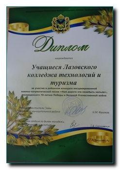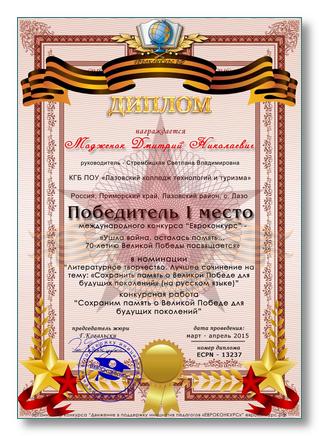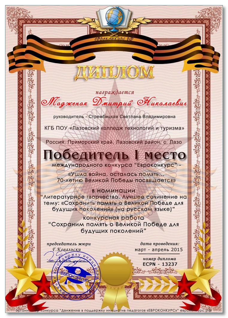 Студент Лазовского колледжа Модженок Дмитрий занял I место в международном конкурсе «Евроконкурс» «Ушла война, осталась память…», который был посвящен 70-летию Великой Победы. Дмитрий написал сочинение на тему «Сохраним память о Великой Победе для будущих поколений», в котором рассказал о своем прадеде Модженок Фёдоре Парамоновиче, который дошел до Берлина, защищая свою Родину.