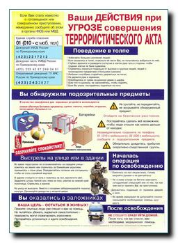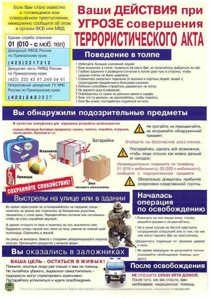 РЕКОМЕНДАЦИИ КУДА ОБРАЩАТЬСЯ? Телефоны по которым вы можете сообщить о фактах террористических угроз или другую информацию о противоправных действиях: 8 (423) 292-97 -90 телефон доверия ГСУ СК РФ по Приморскому краю; 8 (423) 221-44-00 телефон оперативного дежурного УМВД РФ по Приморскому краю; 8 (423) 243-28 -27 телефон оперативного дежурного ГУ МЧС РФ по Приморскому краю. ВНИМАНИЕ! Условия прохождения военной службы по контракту