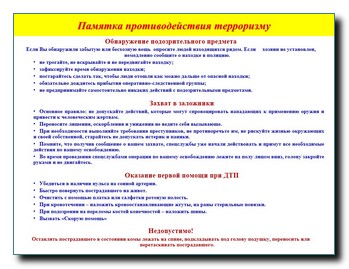 Всегда необходимо обращать внимание на окружающих вас незнакомых людей. Террористы, как правило, действуют скрытно, стараясь не попадаться на глаза ни правоохранительным органам, ни простым гражданам. Но их деятельность вполне может показаться необычной или подозрительной. Если признаки странного поведения не находят естественного объяснения, немедленно сообщите об этом в силовые структуры.Будьте внимательны, постарайтесь запомнить приметы этих людей, отличительные черты их лиц, одежду, имена, клички, возможные шрамы и татуировки, особенности речи и манеры поведения, тематику разговоров и т.д. Не пытайтесь их останавливать сами, иначе вы можете стать их первой жертвой.